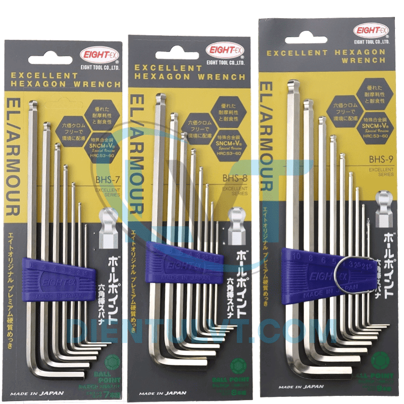 - BHS-9: Bộ lục giác đầu bi 9 cây, thương hiệu Eight (Nhật Bản), chuẩn hệ mét.