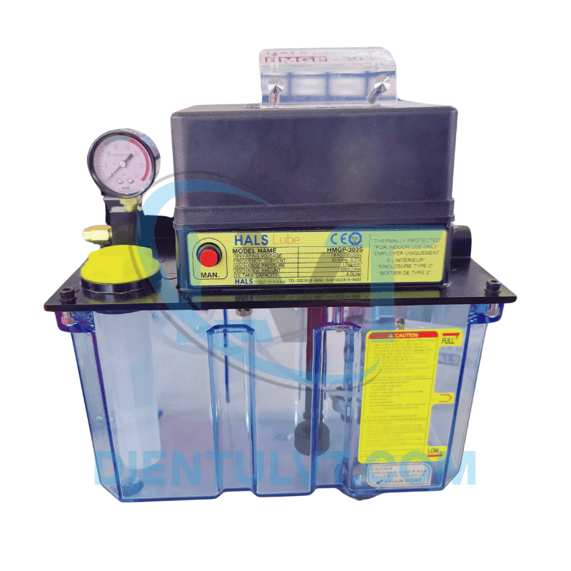 Bơm bôi trơn HMGP-303M là một máy bơm dầu định lượng (fixed quantity lubrication pump) do HALS (Hàn Quốc) sản xuất, được thiết kế để cung cấp dầu bôi trơn với lưu lượng cố định cho các máy công cụ lớn, đặc biệt là các hệ thống tự động hóa công nghiệp. Với bể chứa 2 lít, áp suất định mức 17kg/cm², và khả năng điều khiển bên ngoài, bơm này phù hợp cho các ứng dụng như máy CNC, máy dập, hoặc dây chuyền sản xuất. Sản phẩm nổi bật với độ bền cao, thiết kế đúc khuôn nguyên khối, và tích hợp cảm biến áp suất/dầu, đảm bảo vận hành ổn định và chính xác.