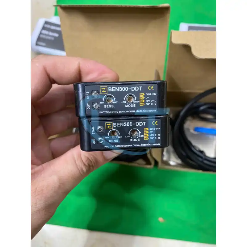 Cảm biến BEN300-DDT là cảm biến quang điện loại phản xạ khuếch tán (thu-phát chung) của hãng Autonics, có thiết kế dạng hộp kích thước nhỏ gọn 18x50x50mm. Sản phẩm sử dụng nguồn sáng LED hồng ngoại 940nm để phát hiện các vật liệu mờ và đục trong phạm vi khoảng cách lên đến 300mm.