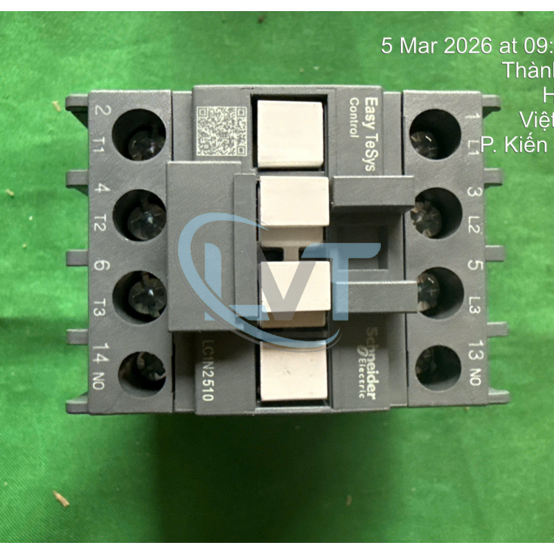 Khởi động từ LC1N2510M5N là contactor 3 pha thuộc dòng TeSys N của Schneider Electric, định mức dòng 25A AC-3 (cho động cơ), điện áp cuộn coil 220VAC 50/60Hz, cấu hình 3 cực chính kèm 1 tiếp điểm phụ NO (1NO). Sản phẩm có khả năng đóng cắt động cơ lên đến 11kW tại 400VAC, chịu tải AC-1 lên đến 40A, điện áp cách điện 690V và điện áp chịu xung 6kV. Cấu tạo từ vật liệu cách điện cao cấp chịu nhiệt, tiếp điểm bạc hợp kim chất lượng cao đảm bảo độ bền cơ học lên đến 15 triệu lần đóng cắt, cuộn coil chống quá nhiệt, lò xo cơ khí chắc chắn, vỏ nhựa kỹ thuật bền bỉ chống va đập và bụi bẩn. Ưu điểm nổi bật là hoạt động êm ái nhờ cơ chế nam châm kinh tế, tiết kiệm điện năng, độ tin cậy cao trong môi trường công nghiệp khắc nghiệt, dễ lắp đặt trên ray DIN hoặc vít, tích hợp tốt với các phụ kiện như khối tiếp điểm phụ, rơ le nhiệt và bảo vệ quá tải. Ứng dụng thực tế phổ biến trong tủ điều khiển động cơ, hệ thống bơm nước, quạt gió, băng chuyền sản xuất, máy nén khí, máy nghiền, hệ thống chiếu sáng công nghiệp, thang máy, máy móc chế biến thực phẩm và các ứng dụng tự động hóa cần đóng cắt động cơ 3 pha đáng tin cậy với công suất trung bình.