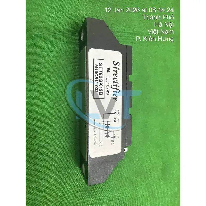 Về cấu tạo, STT60GK12B bao gồm hai tinh thể Thyristor (SCR) được kết nối nối tiếp bên trong một vỏ hộp nhựa Epoxy đúc chân không chắc chắn. Các đầu cực được thiết kế dạng bắt vít chịu dòng cao, đảm bảo kết nối điện ổn định dưới tác động của rung động cơ học. Khả năng chịu đựng dòng xung đỉnh (Surge current) của dòng SEMIPACK này rất cao, giúp bảo vệ hệ thống trước các sự cố quá tải tức thời.