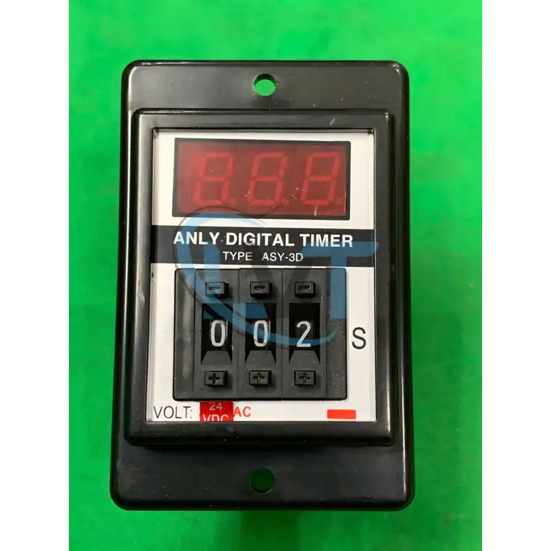 Rơ le thời gian ASY-3D-999s 24DVC là bộ hẹn giờ kỹ thuật số đa năng thuộc series ASY-3D của hãng ANLY, Đài Loan, được thiết kế chuyên dụng để kiểm soát thời gian chính xác trong hệ thống tự động hóa với phạm vi cài đặt từ 0.1 giây đến 999 giây và hai tiếp điểm độc lập (1 delay + 1 instantaneous) để truyền tín hiệu mà không cần mạch phụ trợ. Sản phẩm có điện áp hoạt động 24V DC, công suất tiêu thụ 1.0W, dòng cắt tải 5A tại 250V AC, tần số dao động thạch anh cho độ chính xác ±0.005%/ngày, cùng 7-segment LED hiển thị rõ nét và núm xoay pushwheel để thiết lập thời gian mà không gây sai lệch dưới tải biến đổi. Được chế tạo từ vỏ nhựa PVC chống cháy kết hợp tiếp điểm bạc chống oxy hóa và bo mạch PCB cách điện cao, linh kiện này nổi bật với độ bền cao chịu nhiệt độ -10°C đến 50°C, độ ẩm 35-85% RH không ngưng tụ, giúp tuổi thọ cơ học hơn 10 triệu chu kỳ và điện hơn 100.000 chu kỳ mà không bị lệch thời gian hoặc hỏng hiển thị dưới rung động 10-55Hz. Ưu điểm lớn của rơ le thời gian ASY-3D-999s 24DVC nằm ở thiết kế nhỏ gọn kích thước 50x62x18mm trọng lượng chỉ 150g, dễ lắp đặt trên đế 8 chân tròn DIN rail mà không cần công cụ phức tạp, đồng thời hỗ trợ nhiều chế độ (count up/down, delay on/off) và đạt chuẩn CE/UL để giảm chi phí lập trình hệ thống lên đến 20%. Sản phẩm phù hợp ứng dụng trong tủ điện PLC để hẹn giờ bật/tắt đèn LED chiếu sáng tự động trên dây chuyền sản xuất thực phẩm mà không gây nhiễu tín hiệu, trong máy đóng gói để kiểm soát thời gian kẹp 999 giây cho túi ni lông với độ chính xác cao, hoặc trong hệ thống tưới tiêu nông nghiệp để điều khiển bơm nước 24V DC qua tiếp điểm instantaneous, nơi yêu cầu độ tin cậy cao để tránh lãng phí năng lượng và đảm bảo vận hành ổn định mà không gián đoạn quy trình.